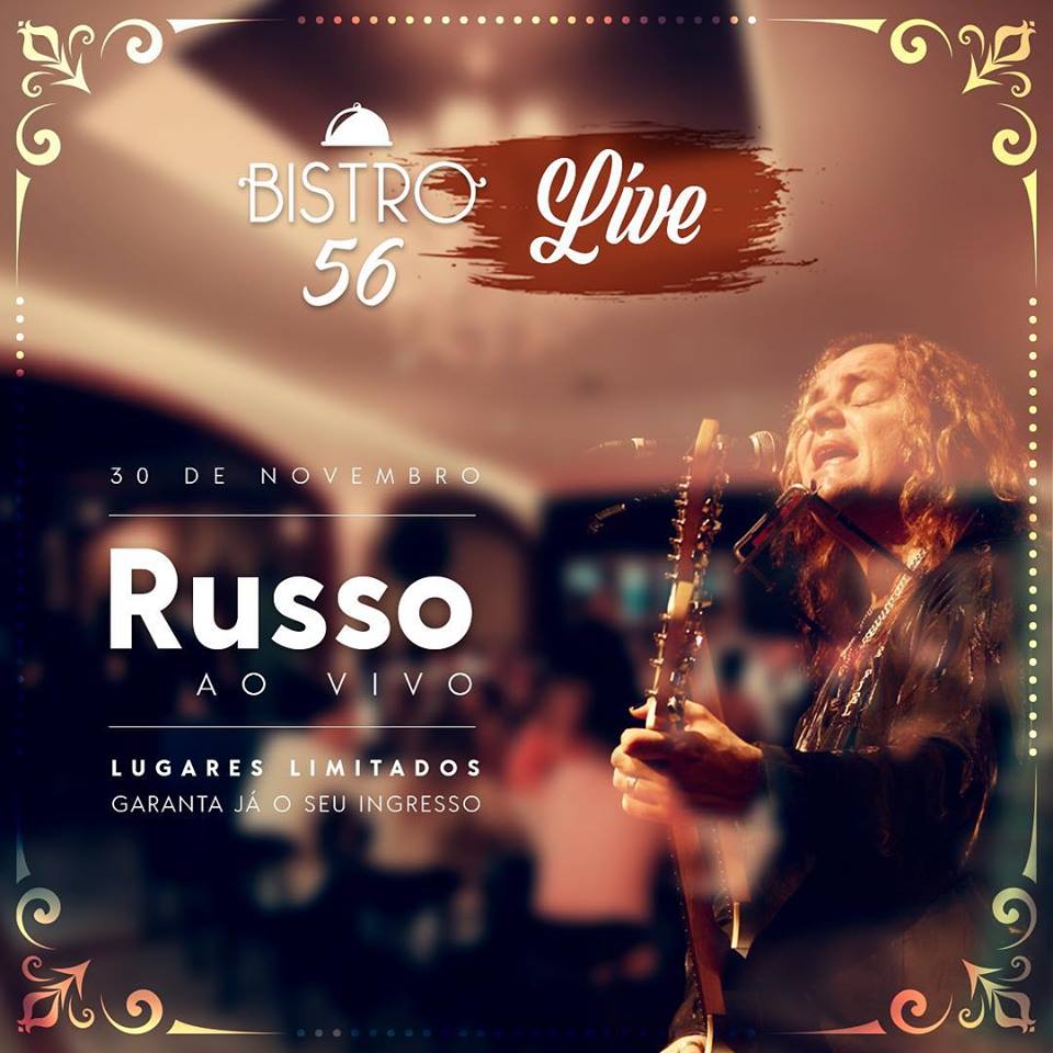 Com patrocínio da Polizel Cópias e Equipamentos, dia 30 de Novembro, acontece o primeiro #Bistro56Live com @russocantor . Vencedor do programa ASTROS (SBT), Russo vem conquistando uma legião de fãs por onde passa, com sua mistura de blues, jazz, rock e country, que unidos a sua voz e seu estilo anos 70 criam uma atmosfera incrível.